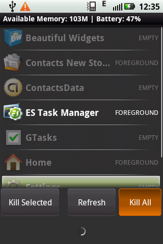 3. Download ES Task manager or any other Task Manager from the Android Market and kill all the processes in memory, five minutes after you start the phone. This kills all the processes which are using your CPU cycles for no purpose and are polling useless things. It also helps in saving battery.